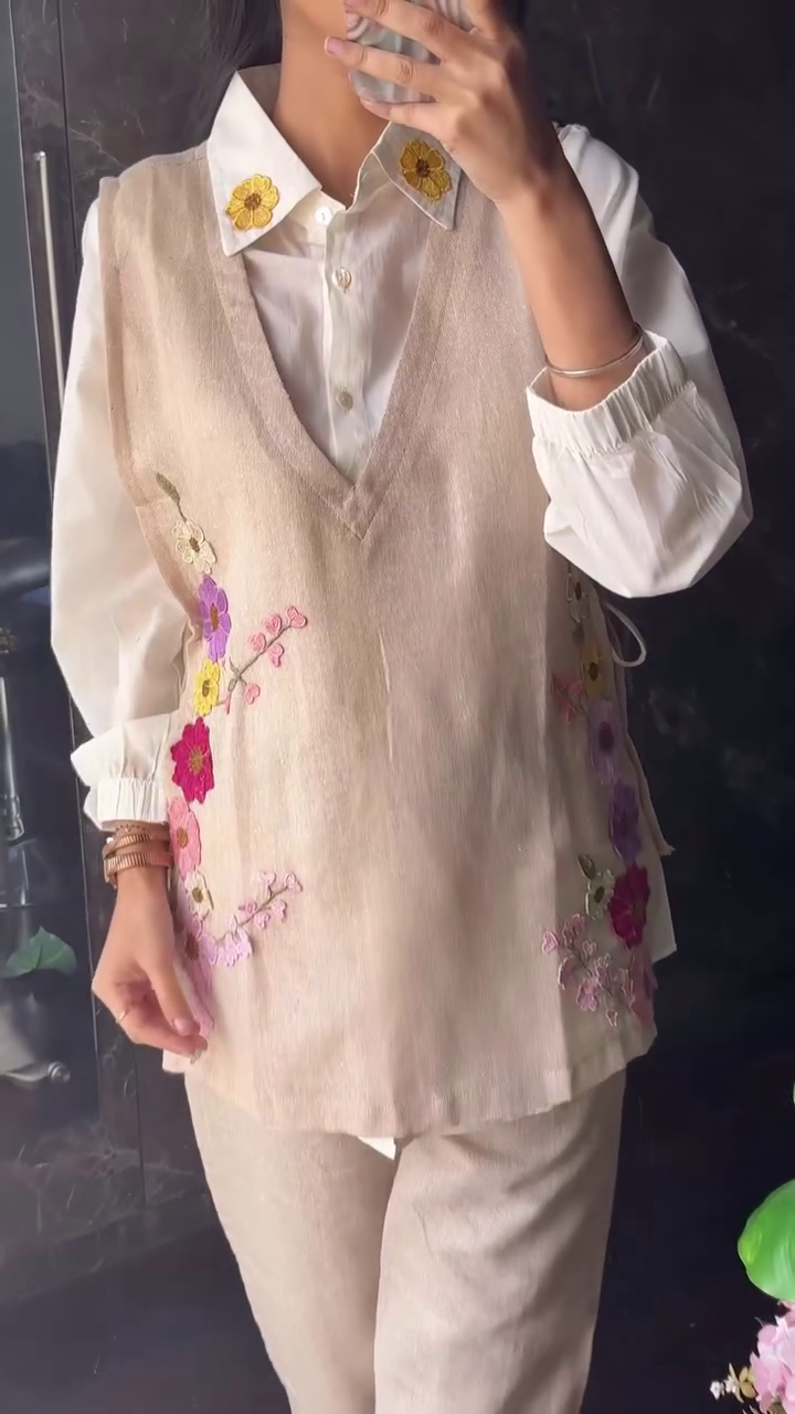 Step into elevated tradition with our White & Beige Co-ord Set, a refined fusion of heritage texture and modern silhouette. Crafted in a premium cotton and jute blend, this set features a layered dress with apron styling, beautifully accented with detailed embroidery.